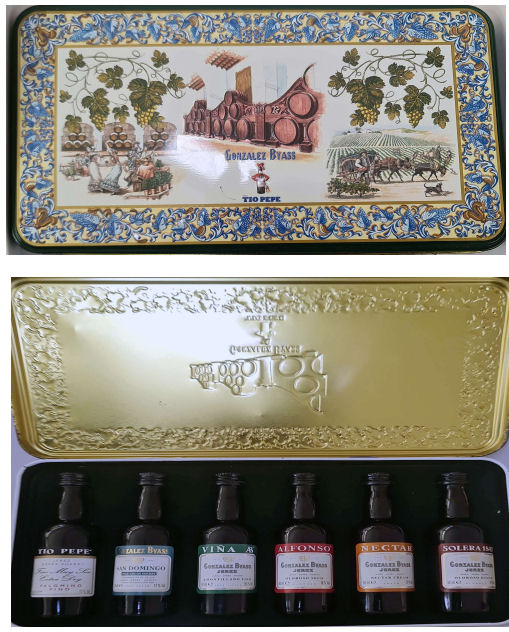 A Beautiful patterned tin case with 6 bottles, Tio Pepe Sherry, Gonzales Byass Pale Cream Sherry, Vina Amontillado Fino, Alfonso Oloroso Seco, Nectar Cream & Solera 1847 Oloroso Dulce