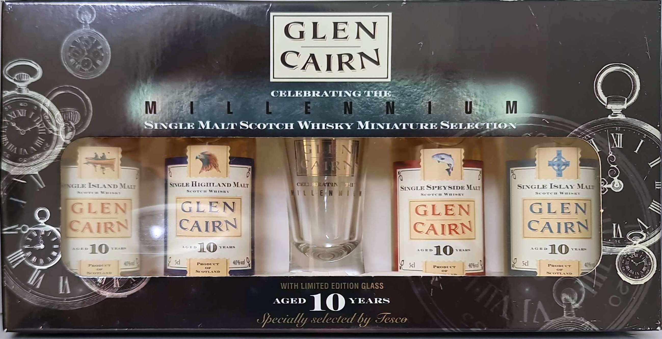 Glen Cairn Whisky celebrating the MILLENNIUM: Single Island Malt, Single Highland Malt, Single Speyside Malt & Single Islay Malt, with limited edition glass. All 10 years old on Millennium year