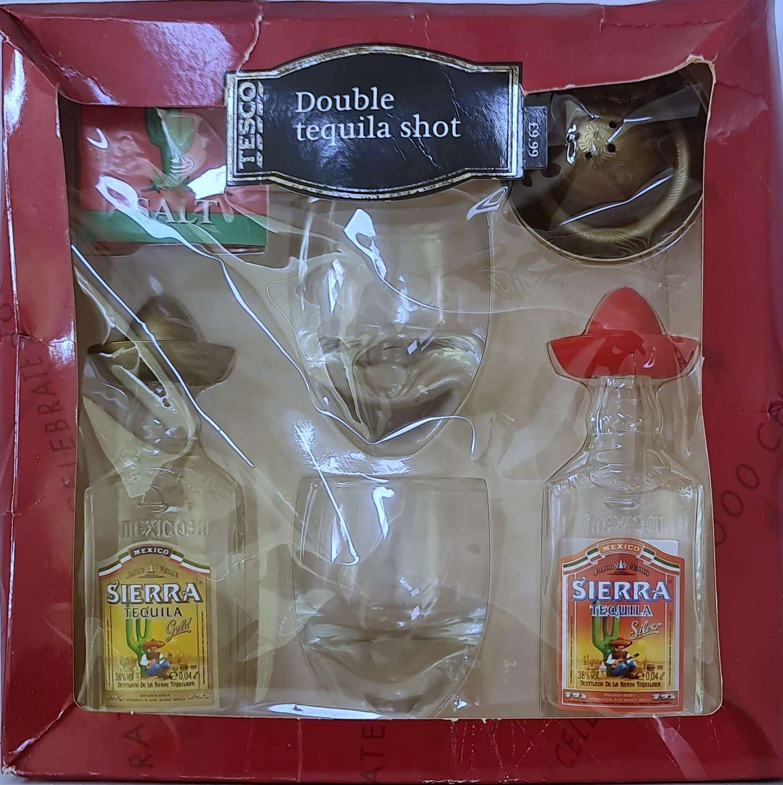 Double Tequila Shot: one Silver & one Gold, two shot glasses, a "Sombrero" salt shaker & a sachet of salt. A year 2000 celebration