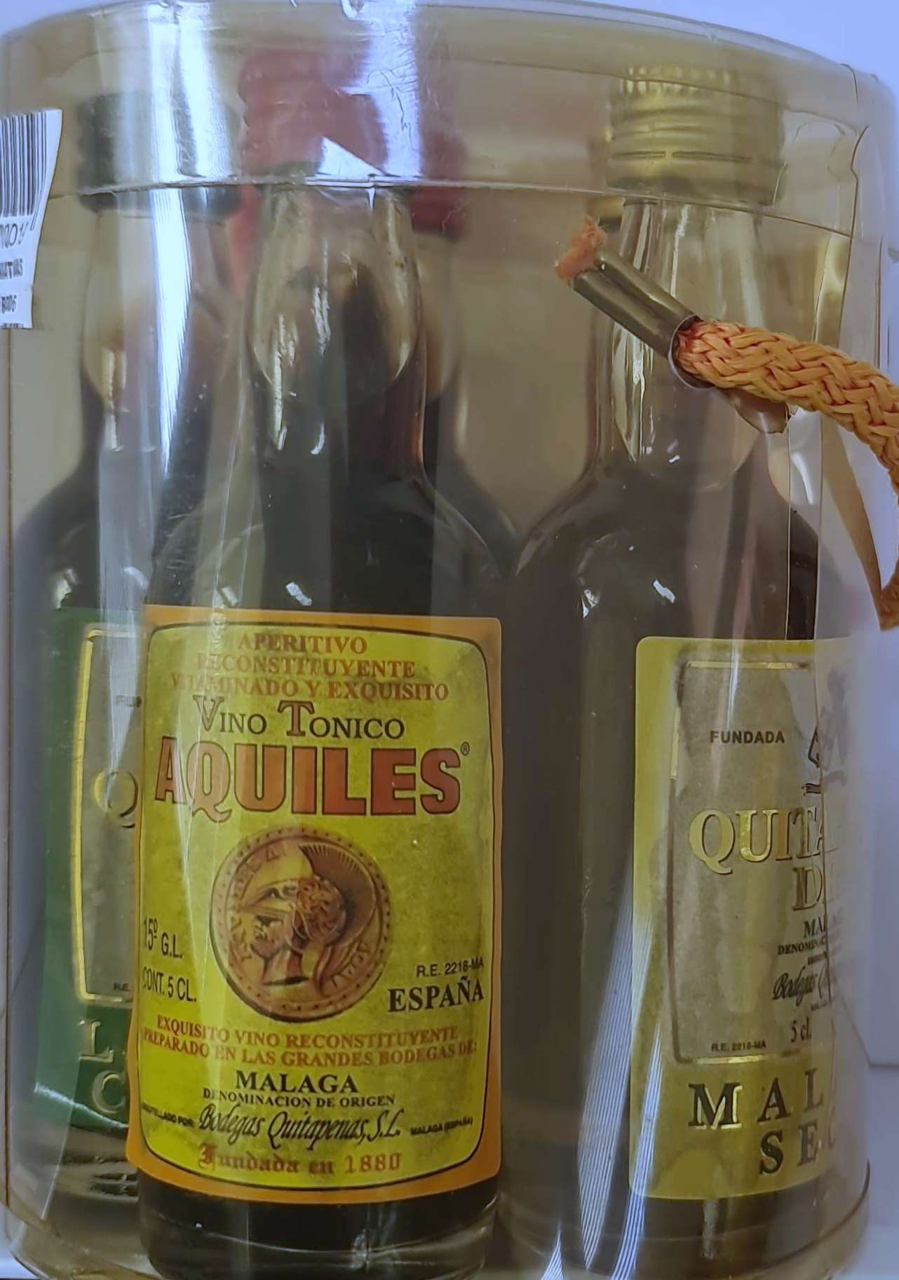 Malaga 5 bottles in a round plastic case with rope type handle: Quitapenas Dorado, Quitapenas Dry, Vino Tonico Aquiles, Quitapenas Lagrima & Quitapenas Malaga