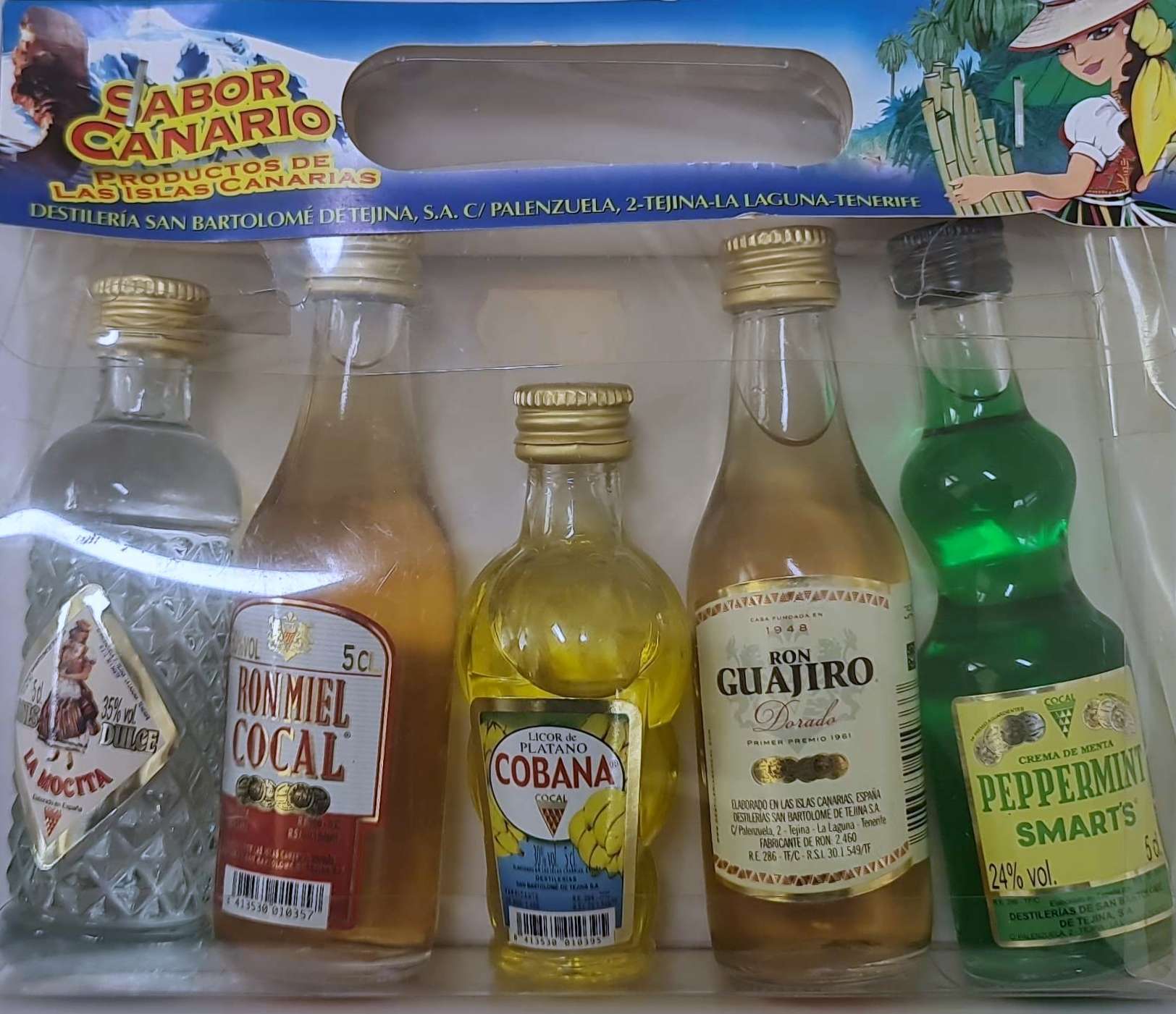 Sabor Canario 5 bottles in a strong plastic carry case: La Mocita, Ronmiel Cocal, Cobana, Ron Guajiro & Peppermint Smarts
