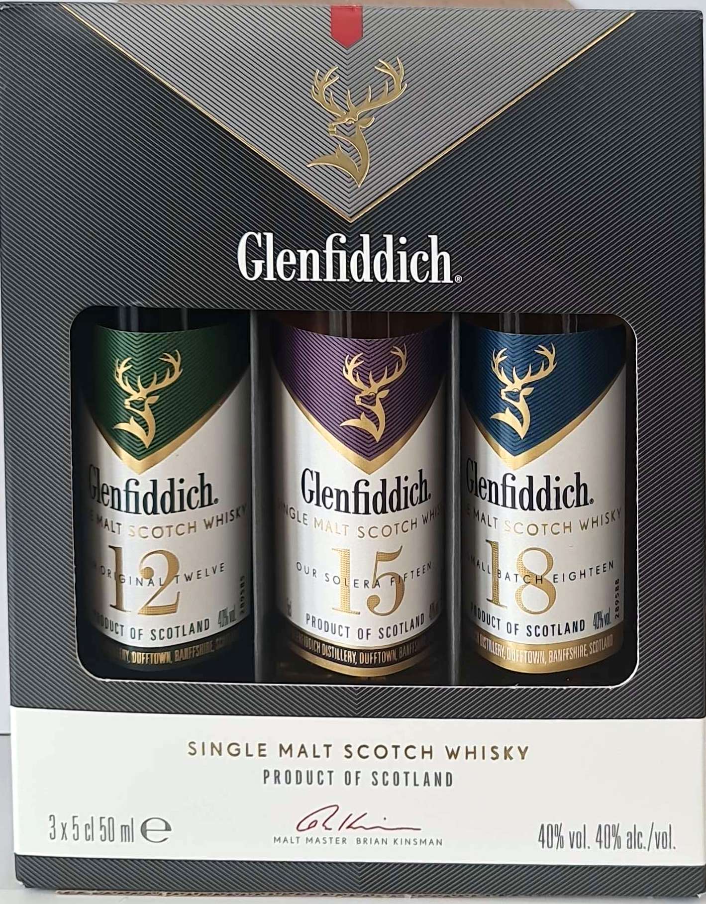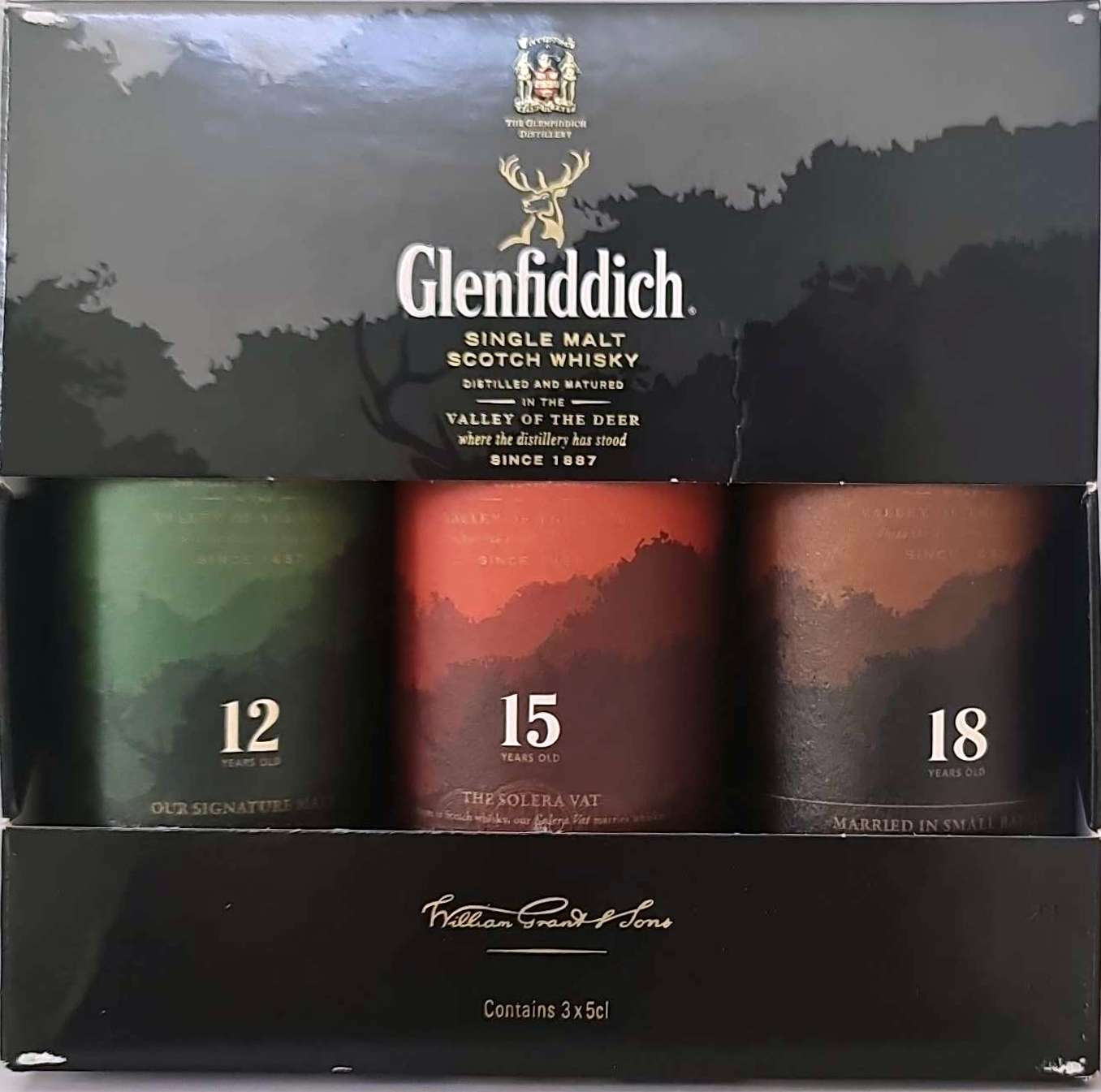 Glenfiddich Whisky: 12 year old Signature, 15 year old Malt & 18 year old Oloroso Sherry & Bourbon
