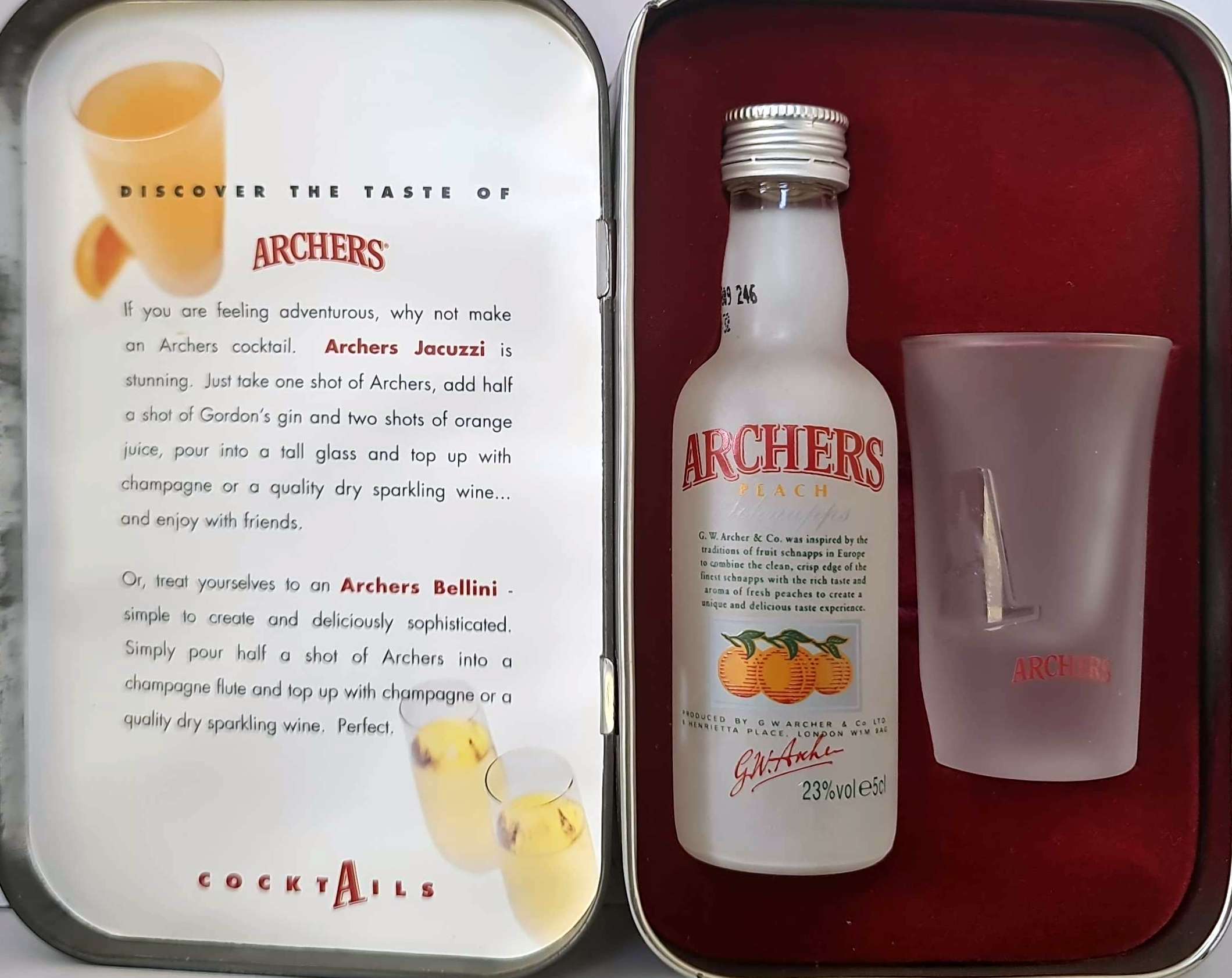 Archers in a silver tin case with 1 Archers & 1 shot glass