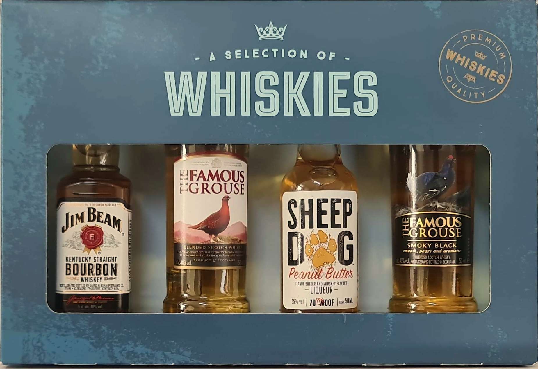 A selection of premium whiskies, Jim Beam Bourbon, The Famous Grouse, Sheep Dog Peanut Butter & Whiskey Liqueur & The Famous Grouse Smoky Black